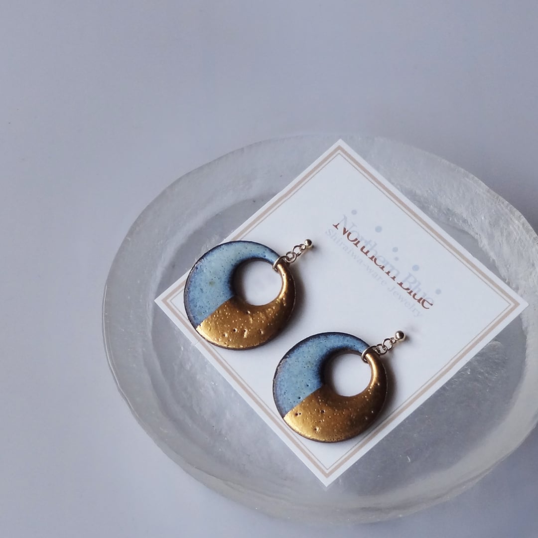 「ユキニツキ-Snow Moon-」は、白岩焼(しらいわやき)の特徴である海鼠釉(なまこゆう)の青と金彩のゴールドのコントラストが特徴的なシリーズ。陶器パーツの上に金の釉薬を塗り800度の窯で焼き付け、この工程を何度も繰り返すことで独特のしっとりとした金の輝きが生まれます。直径30mmのおおぶりサイズでありつつ、繊細な成形法により厚み1.5mmの薄さを実現。陶器の重さを感じさせない軽やかな着け心地です。特別な日をさらに輝かせてくれる、そんなアクセサリーです。